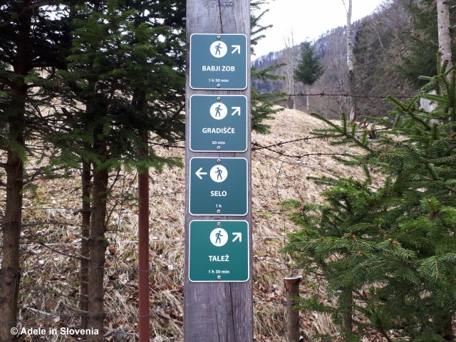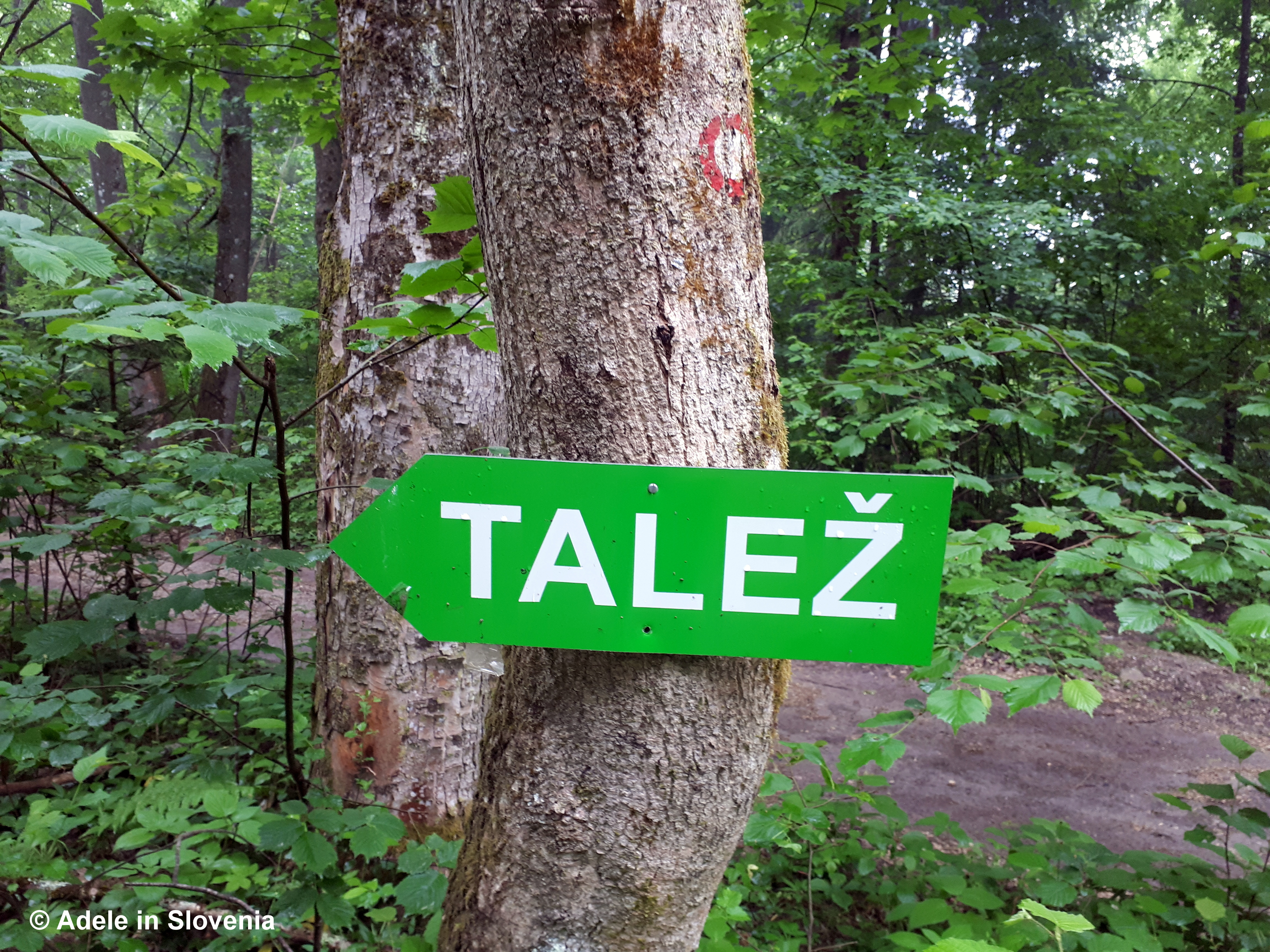 After passing a few houses on your left, you will enter the forest. Continue to the first green waymarker to Talež, where you should turn left, then at the next waymarker turn right. Thereafter, there aren’t any other visible waymarkers but the path is well trodden, and even if you lose your way, just keep heading in a roughly westerly direction until you reach the forest road, which you then follow, again in a westerly direction, towards the Koča na Taležu (Hunters’ Hut on Talež) mountain hut.