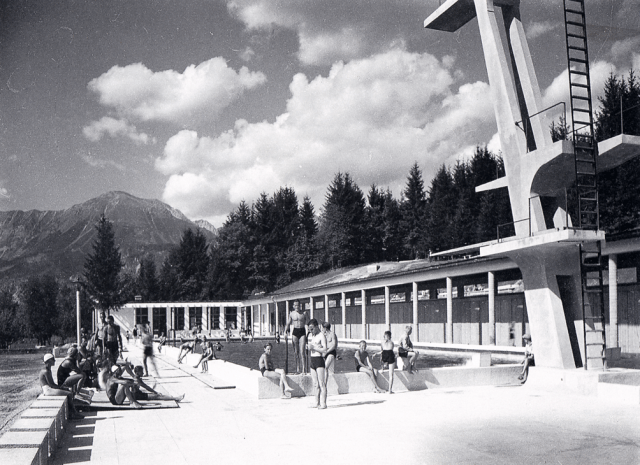 The pool was originally designed by the local architect Ivan Vurnik. It was built in 1932 and is considered one of his most notable projects. The most distinguishing feature, which at its time was considered a daring feat of engineering and architecture, was the high diving platform. The platform was demolished in 1966 but Radovljica’s Olympic-size swimming pool lives on today in the same location.