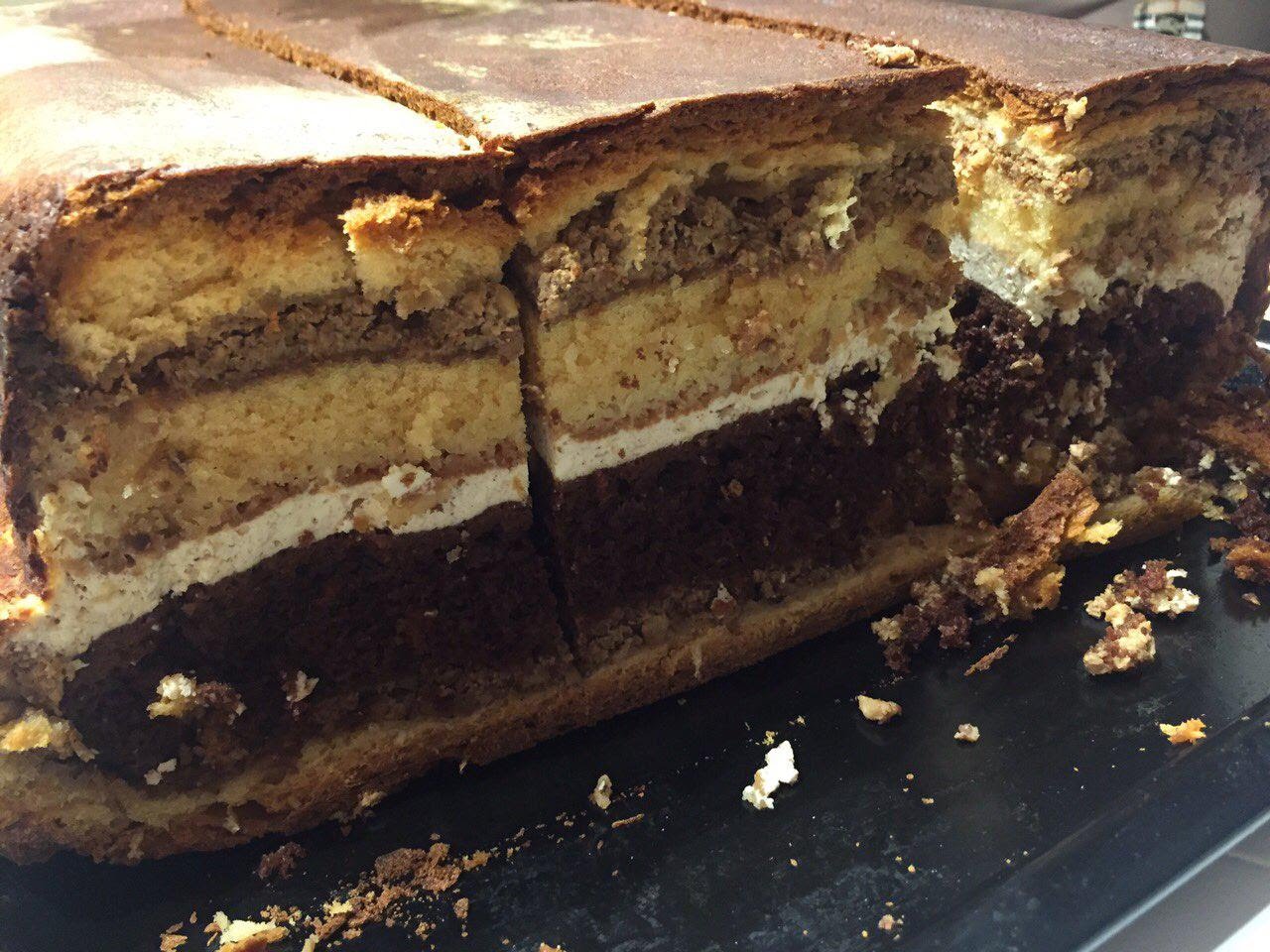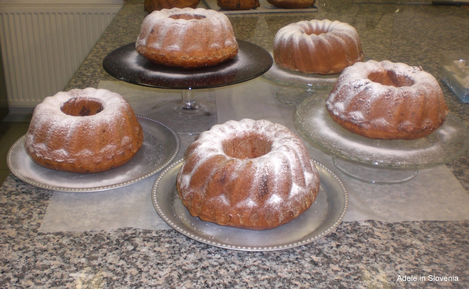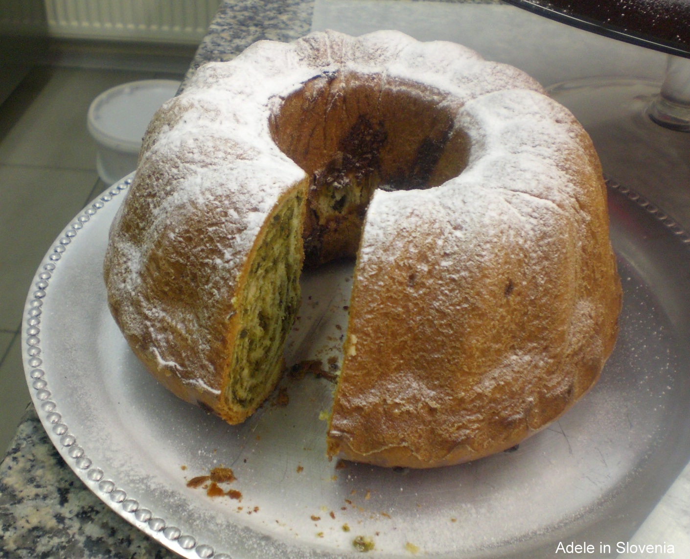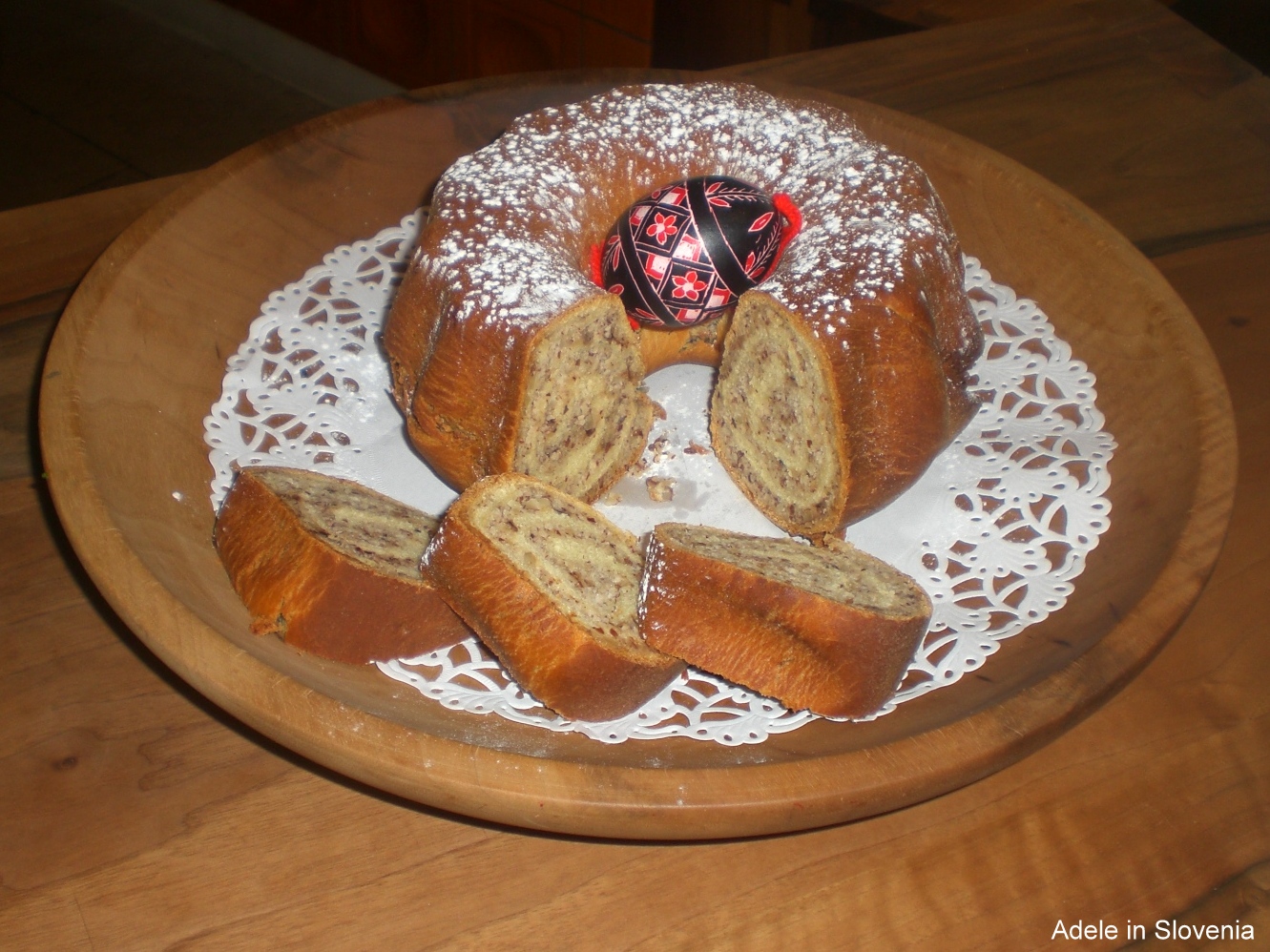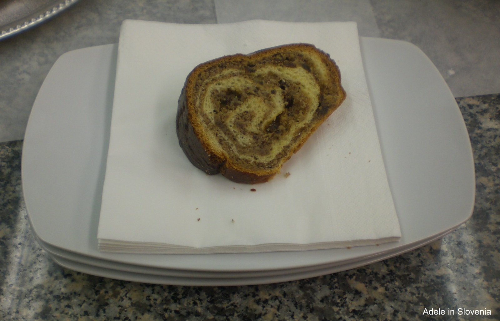 It’s not hard to find potica in Slovenia, far from it, it’s abundantly available, particularly during Easter, Christmas and New Year holidays. I have often read that there are over 80 different types of potica in Slovenia, yet in most shops and bakeries there are only the usual staple varieties, such as; walnut – by far the most commonly found; poppy seed; tarragon; pork crackling; dried fruit; potratna – as seen below – a layered ‘luxury’ potica, made with curd cheese, walnuts and layers of light and dark sponge.