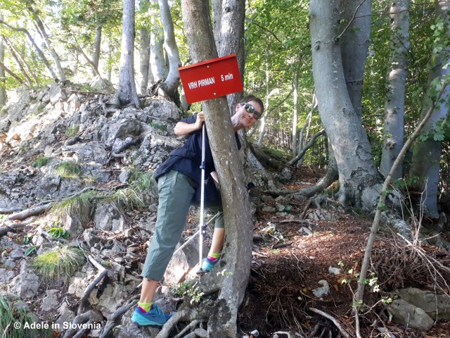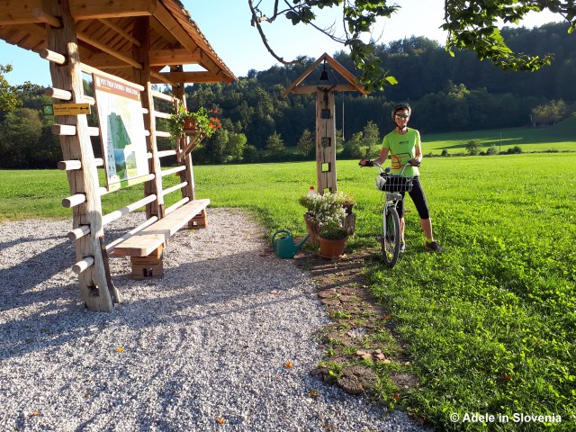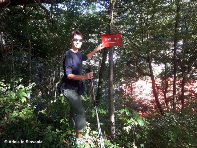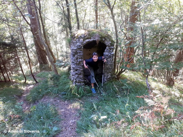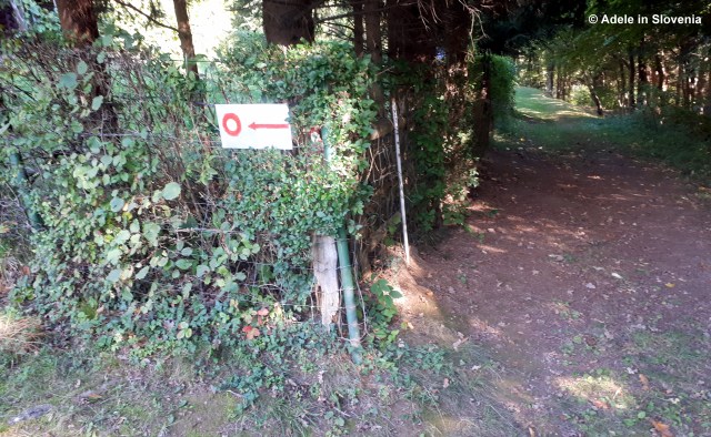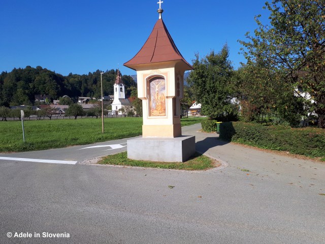 Cross the road and take the path immediately opposite, where there is a shrine and the usual Slovenian red and white circular trail markers.