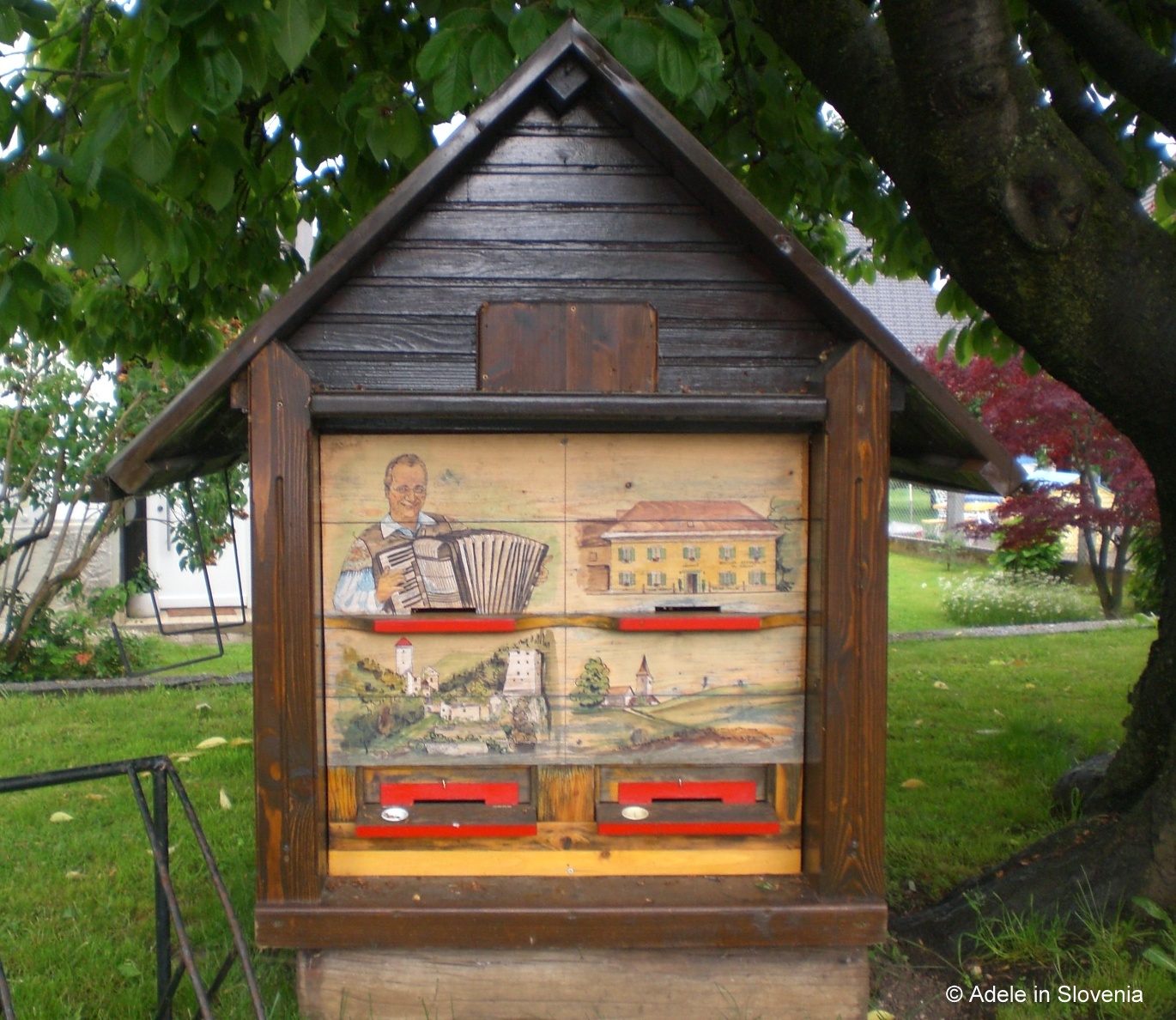 The painted front panels on this small hive are dedicated to the Slovene folk music legend, Slavko Avsenik, from nearby Begunje na Gorenjskem.
