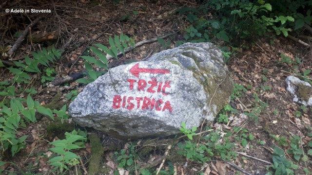 Here you can either continue down the road to return to the start or take the path to the left towards Tržička Bistrica, as shown on the stone below.