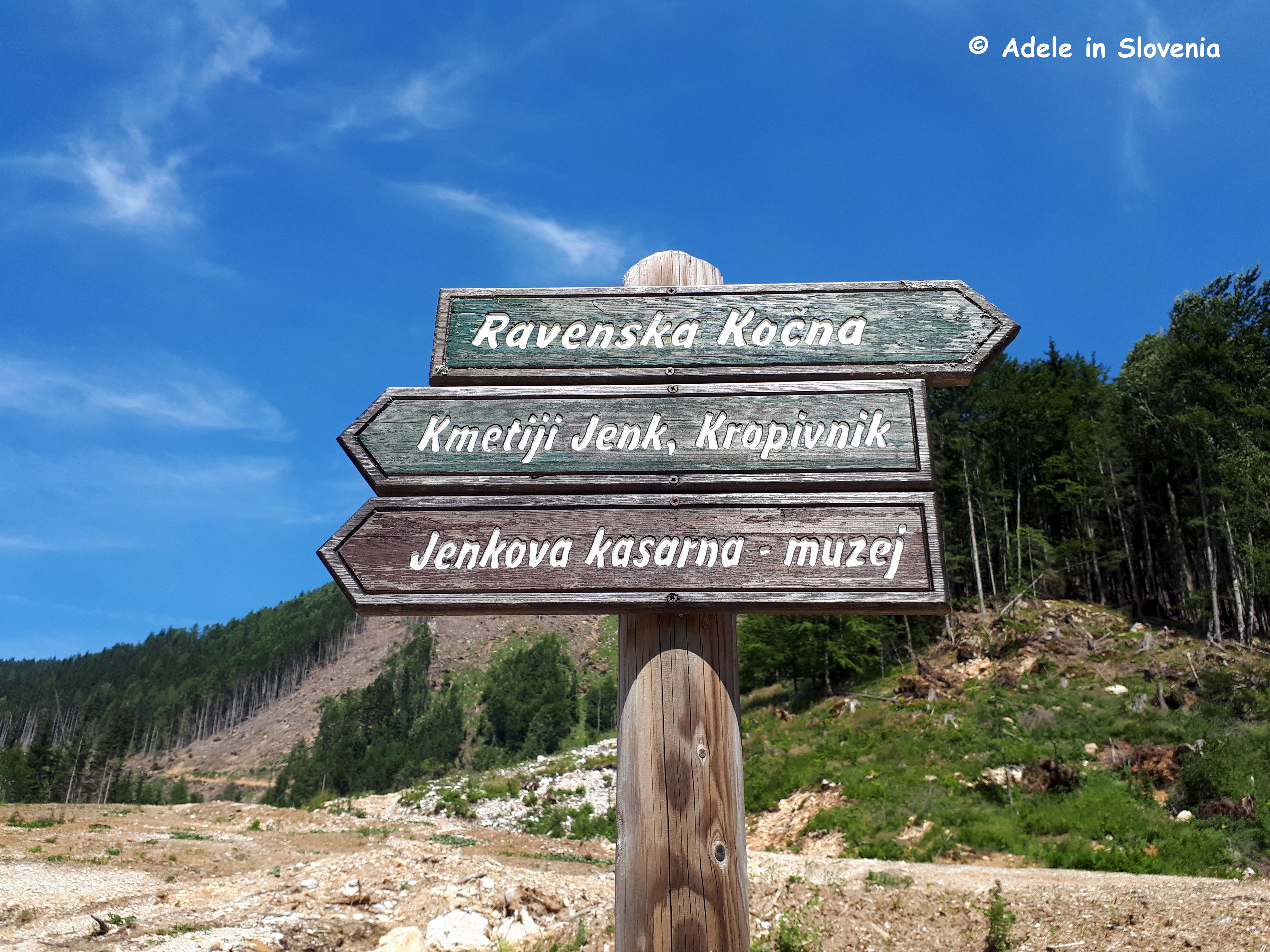 You can continue to the head of the valley, which takes another cca. 30 minutes and is worth it for the views alone. Or, if you would like to continue exploring Jezersko, on returning, instead of walking back towards the lake, follow the tarmac road towards Jenks barracks (Jenkova kasarna).