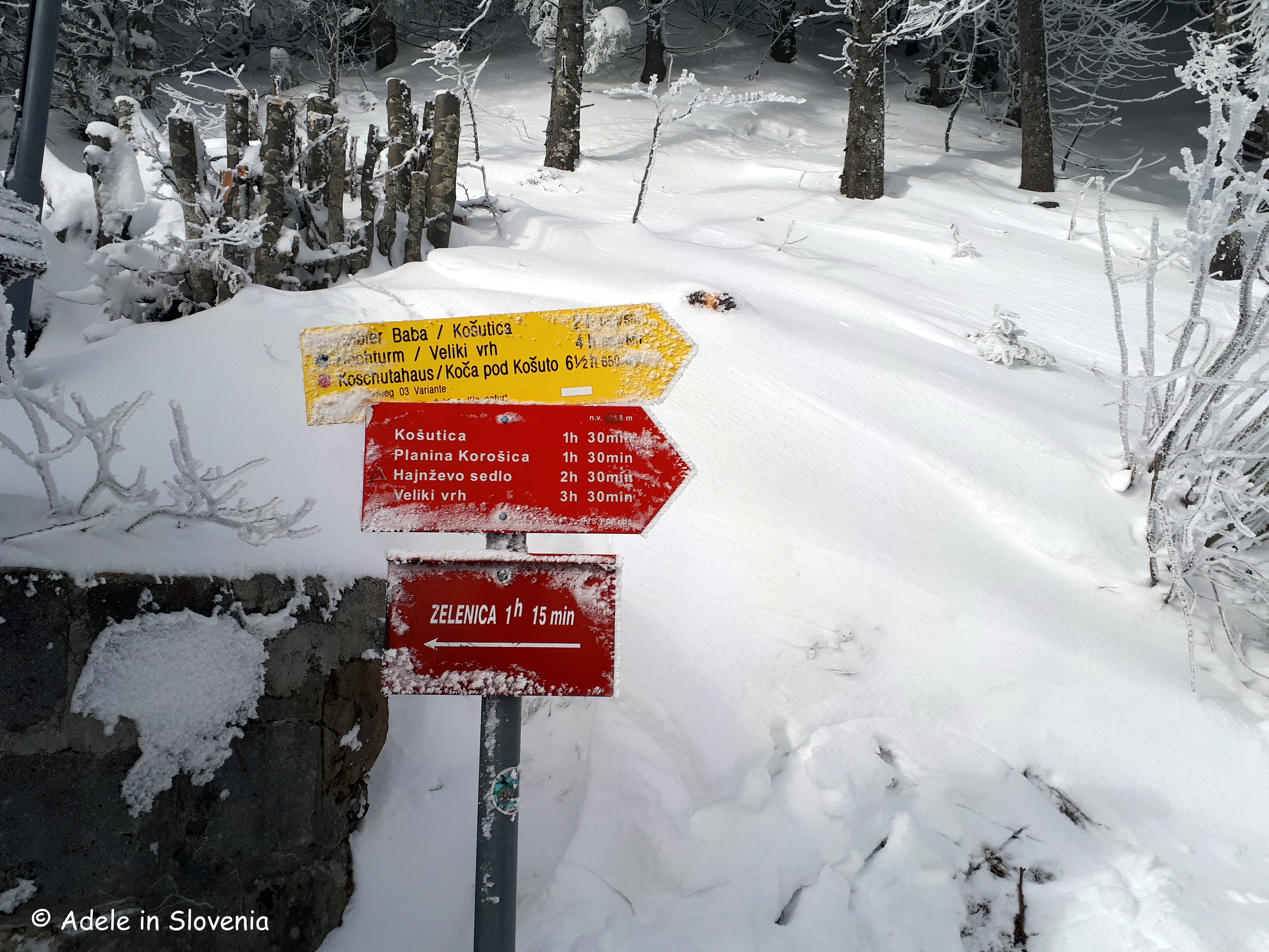 For many the target destination, year-round, is the Dom na Zelenici mountain hut (1,536m) whilst others continue onward to the surrounding peaks such as Triangel (1,704m), Begunščica (2,060m), Vrtača (2,181m) and Na Možeh (1,784m). The hut is open daily in the summer (1.6 – 30.9) and during the rest of the year at weekends and public holidays (1.10-31.5).
