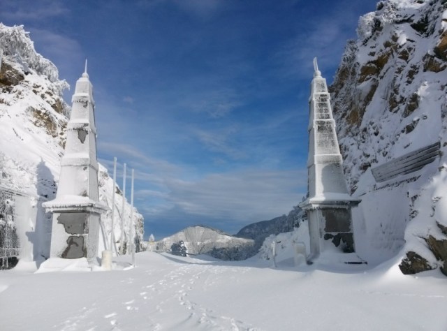 It takes about 45 minutes to walk up to the top where the border is marked by two stone obelisks.